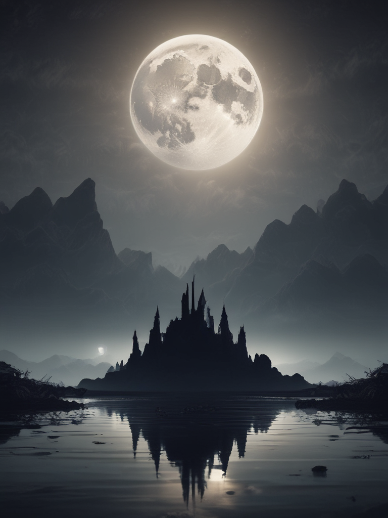 Mythic underworld landscape with dark moonlight and mist, dramatic silhouettes, cinematic lighting, high detail fantasy scene