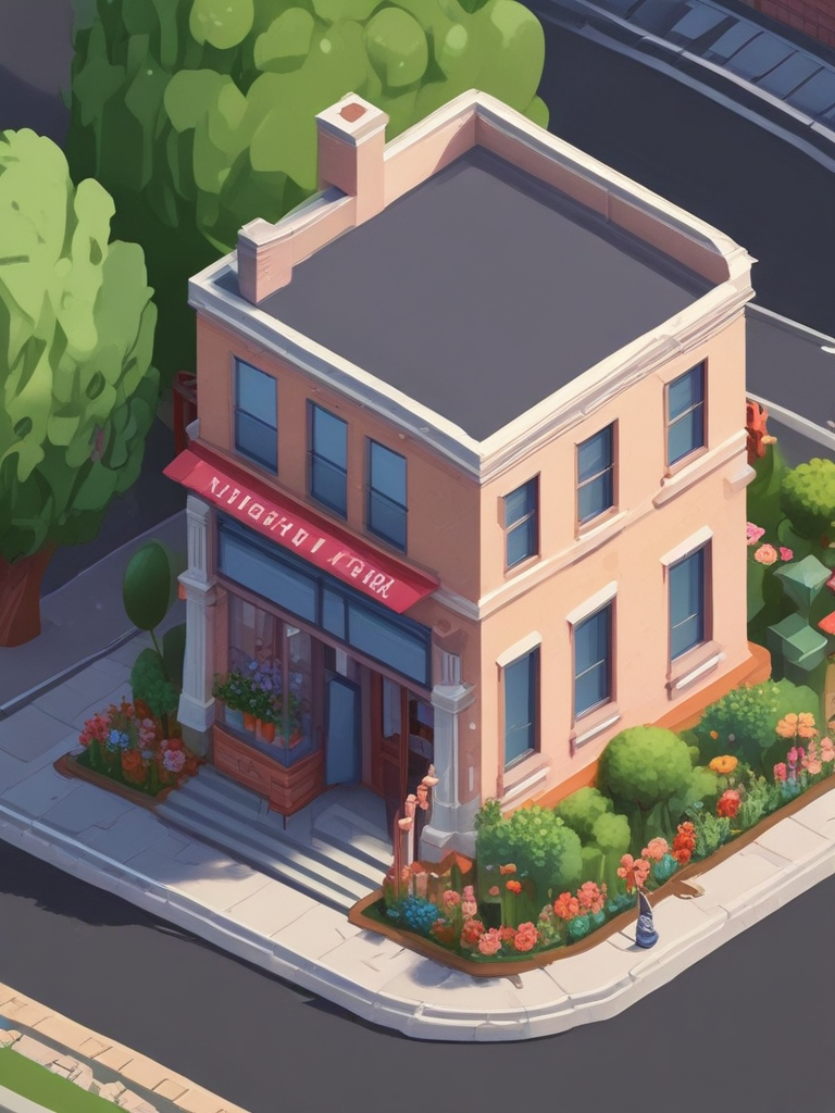 Isometric clean pixel art image of outside of cute design studio