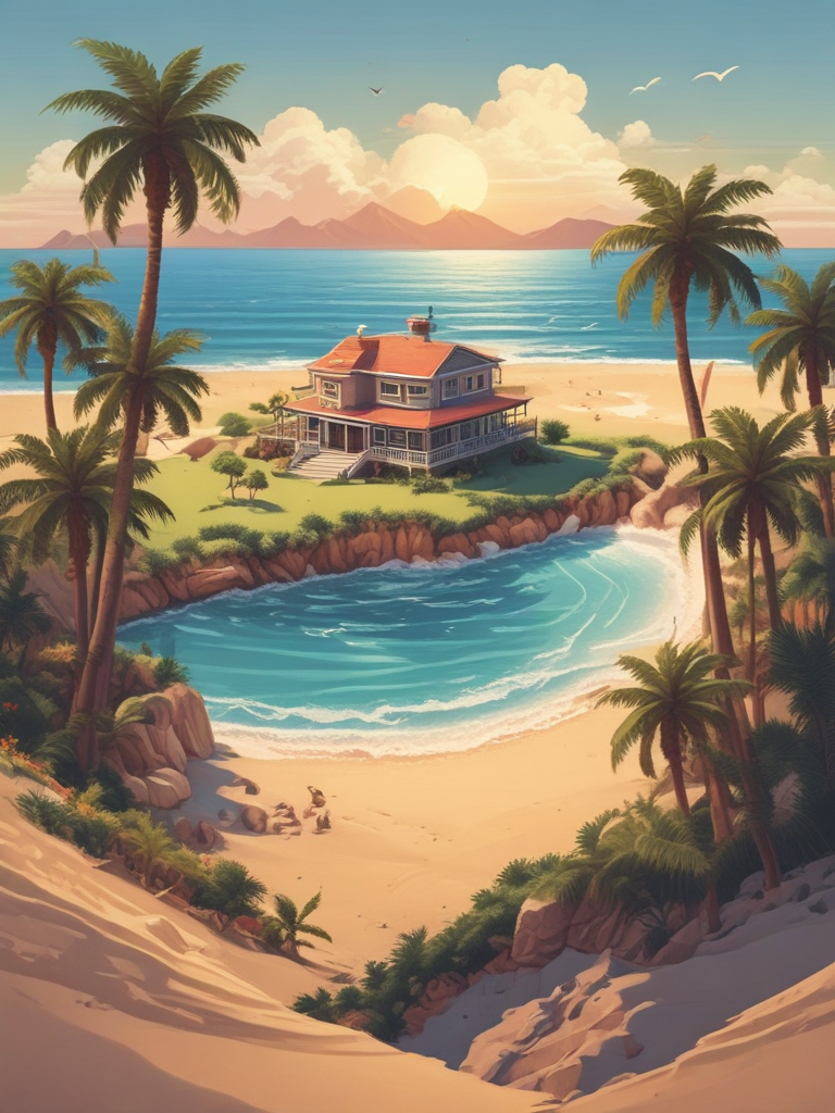 Create an isometric pixel art-style poster with a solid background depicting an island, beach house, a palm tree, and a sand dune, 4k ultra detail, resembling a cinematic movie poster.