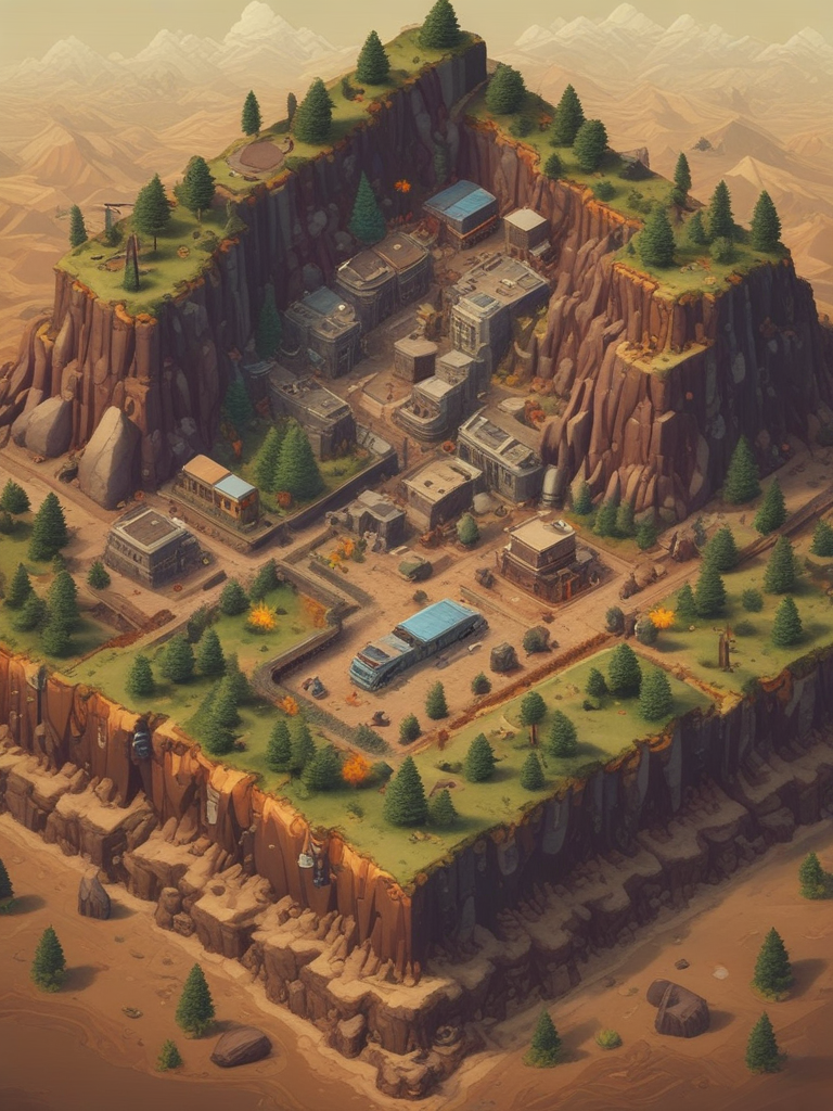 Isometric, post apocalyptic landscape map for a top down isometric mobile game extremely simplistic pixel art, low res blocky, center is empty, no buildings or water